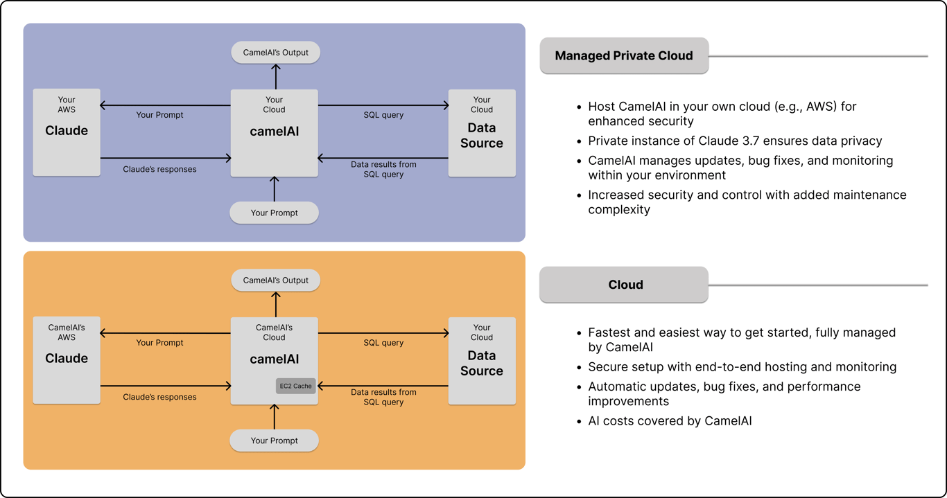 When deploying an AI data analyst like CamelAI, one of the most important decisions is where and how to host it. CamelAI offers two flexible hosting options tailored to different business needs: Cloud (hosted by us) and Managed Private Cloud also known as Self Hosted. Each option provides distinct benefits depending on your security, control, and management preferences.